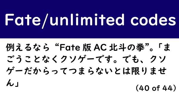 Fate Unlimited Codes といえば無限に続いていくコンボ 一度のミスも許されない キャラゲーとしては申し分ない原作愛だよね | Fate Unlimited Codes といえば無限に続いていくコンボ 一度のミスも許されない キャラゲーとしては申し分ない原作愛だよね | ![]() Fate Unlimited Codes といえば無限に続いていくコンボ 一度のミスも許されない キャラゲーとしては申し分ない原作愛だよね |
